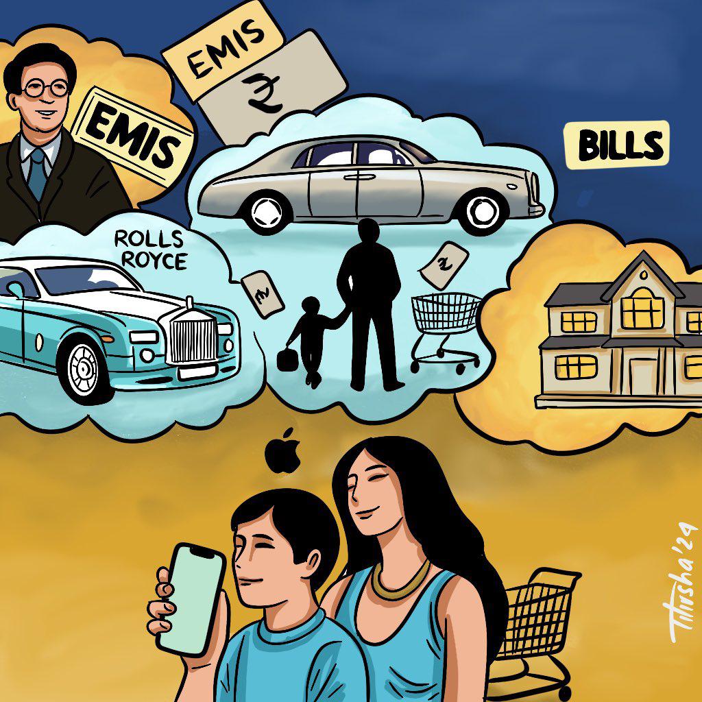 A level above the lower middle class consists of salaried employees. They spend considerable time establishing their reputations as well-off. They dream of having hands-on experience with all the luxury items available on the market, while struggling with end-of-month EMIs. This group of middle-class individuals is more prestige-conscious yet internally devastated by EMIs. The average youth in this category aspires to own an iPhone at any cost. Yet, with manageable monthly installments (EMIs), they can achieve this goal. Many in this generation show off their wealth by driving cars. They also aspire to live in a three-bedroom flat in an urban City.